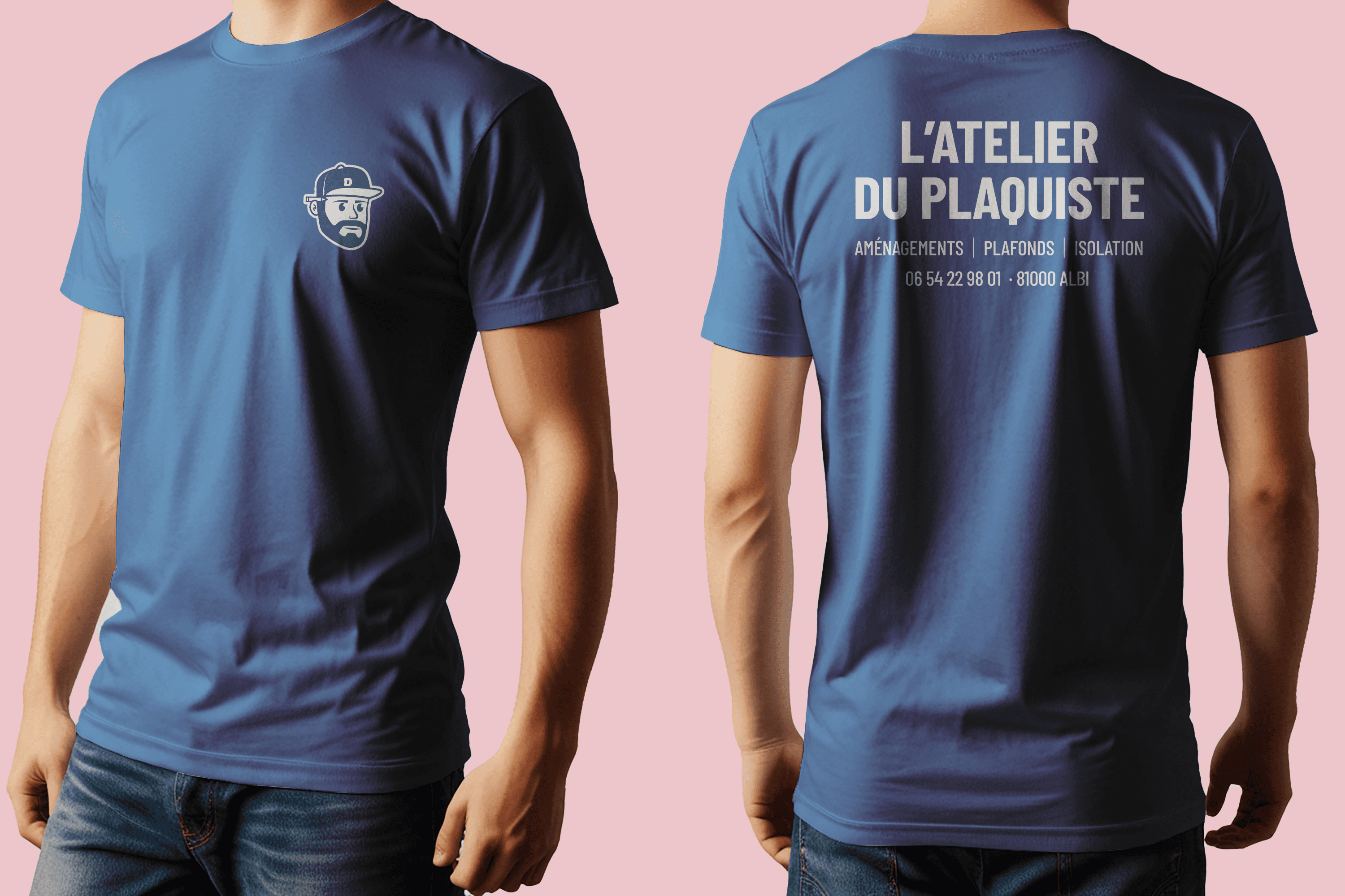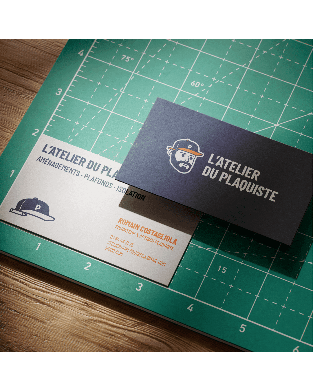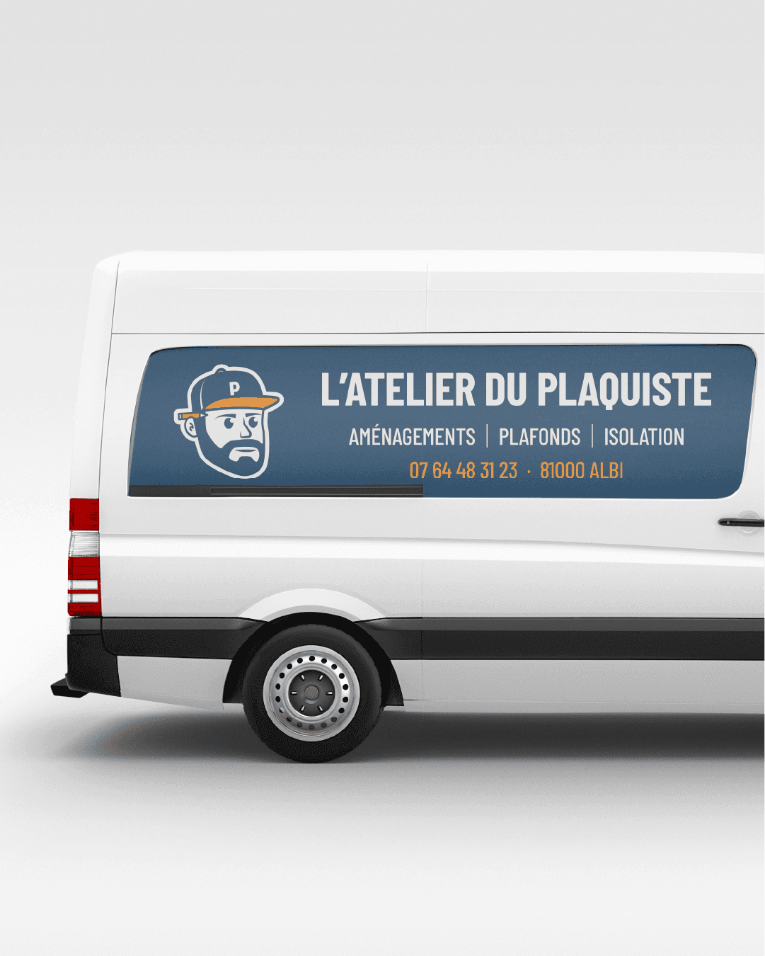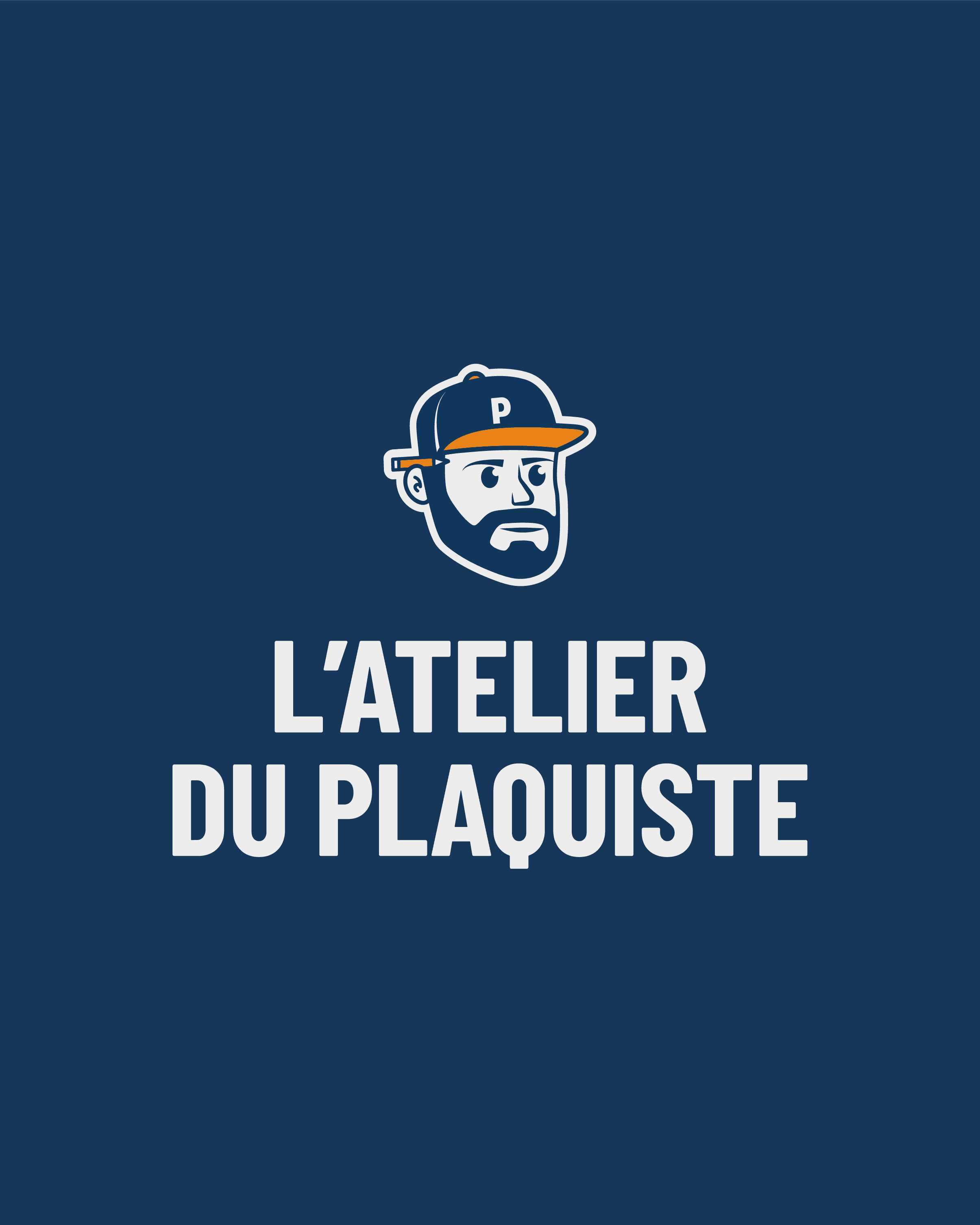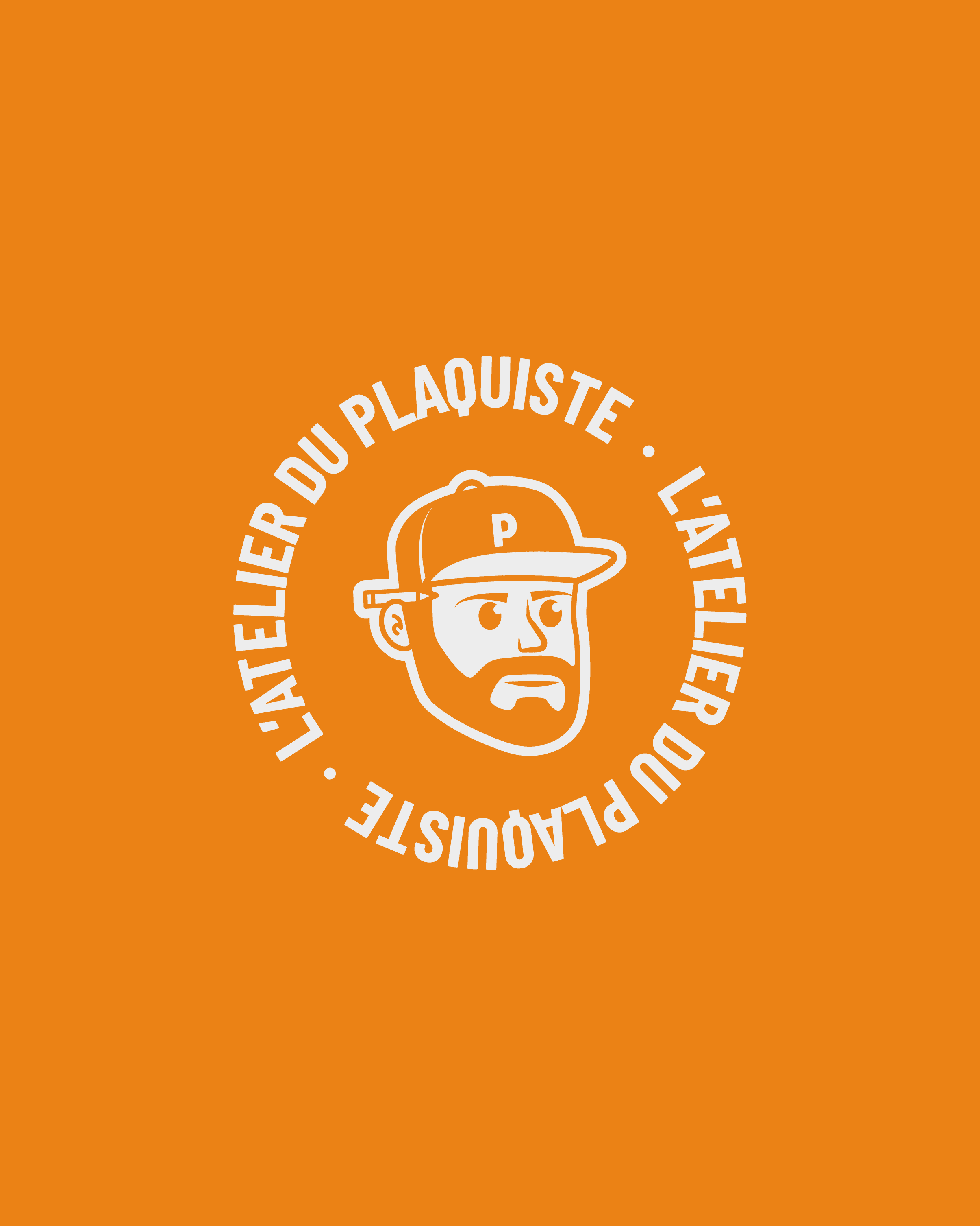 Le logo prend vie sous la forme d'une mascotte, en style cartoon, représentant Romain le fondateur d'ADP. Cette mascotte permet de partager la proximité et le côté humain, des valeurs partagées par son fondateur. Créée de toute pièce, cette mascotte est unique et offre à l'Atelier du Plaquiste une image de confiance et de caractère. Les couleurs utilisées renforcent ces aspects, notamment avec un bleu témoignant d'une stabilité et d'une fiabilité forte. Le bleu est associé à un orange vif qui permet d'identifier directement le secteur du bâtiment et de la construction en partageant de l'énergie, de l'action ainsi que de la chaleur humaine. Finalement, un blanc cassé est utilisé ici pour atténuer la palette tout en faisant référence au métier de plaquiste.